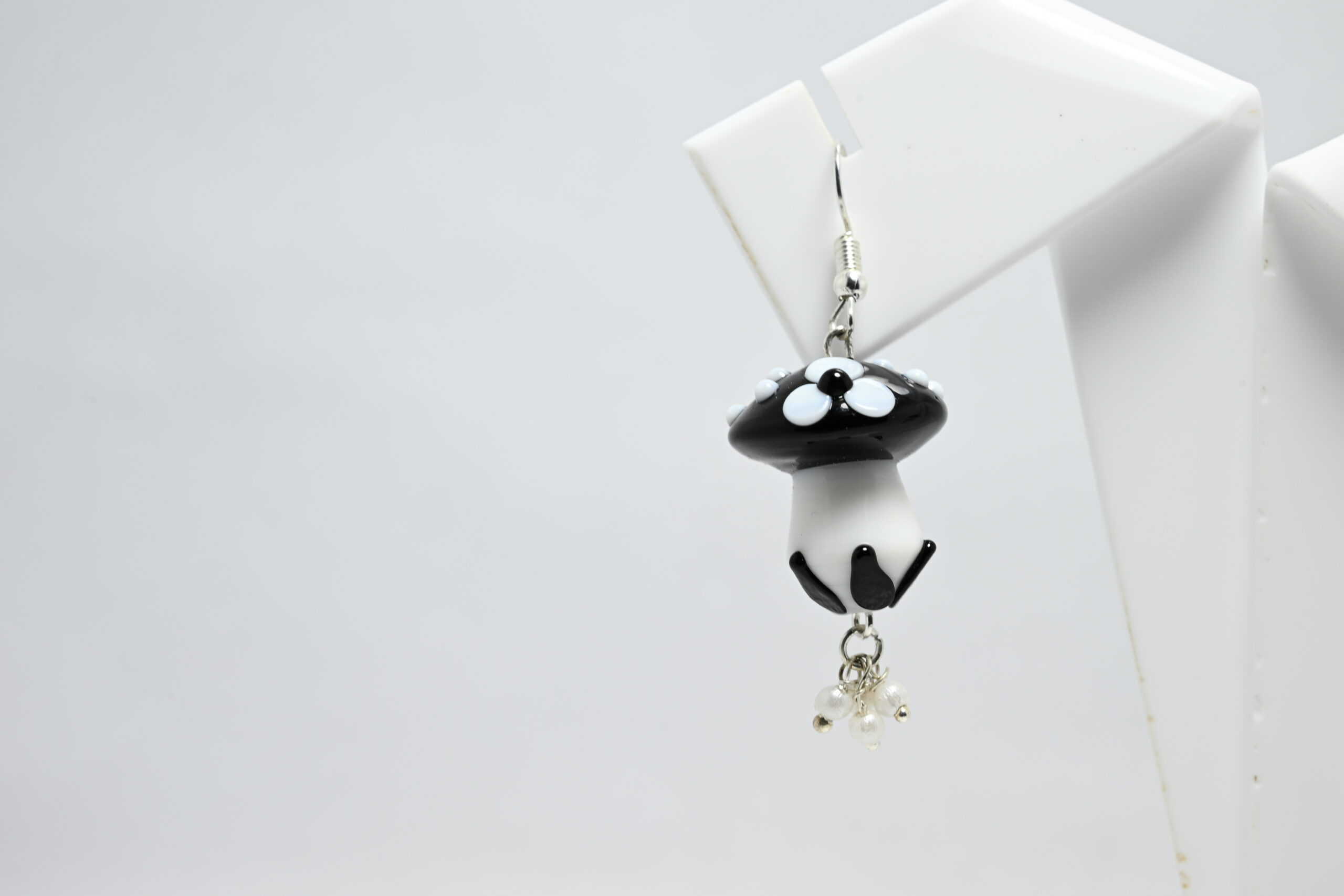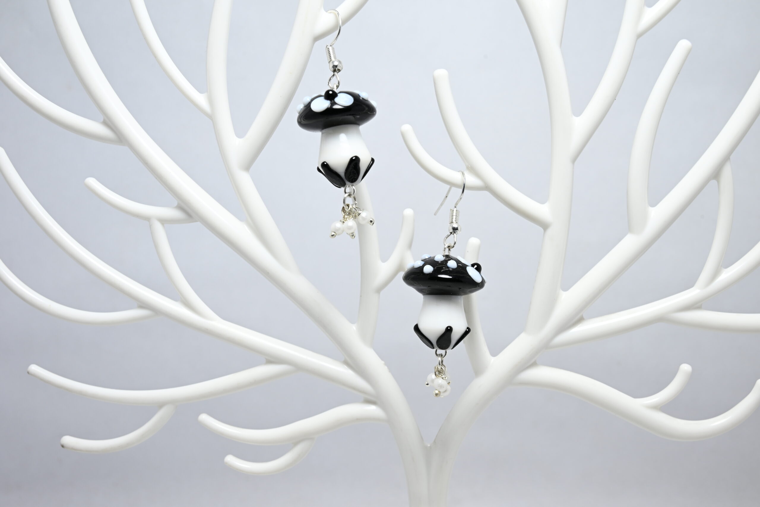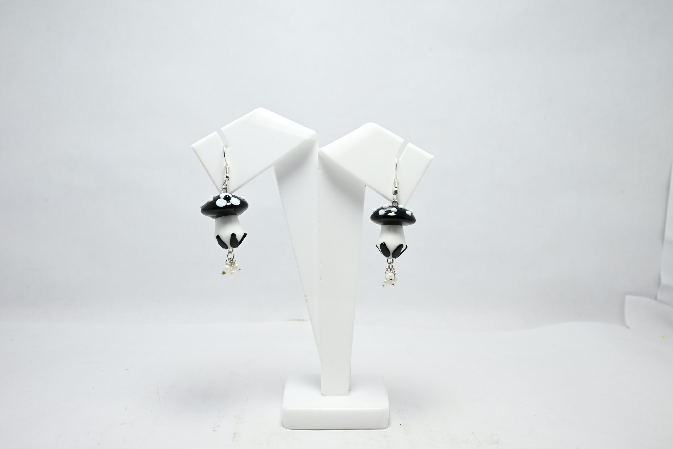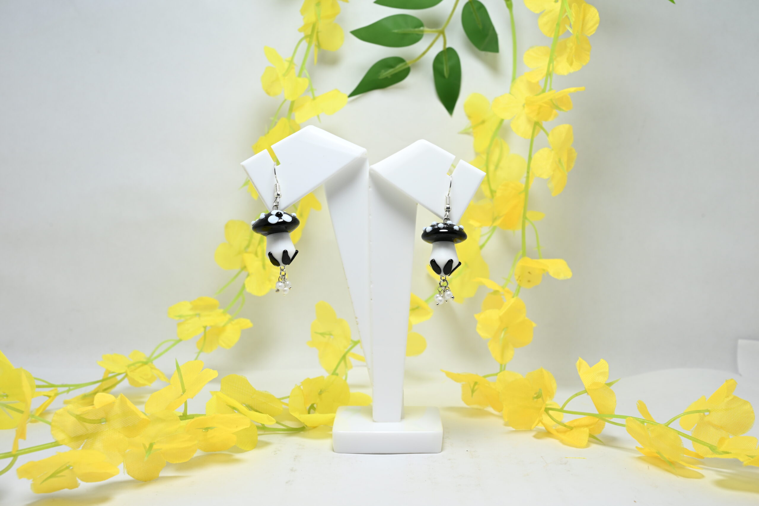 Handmade Lamp-work Glass Beads Earrings (Black & White – Mashroom )